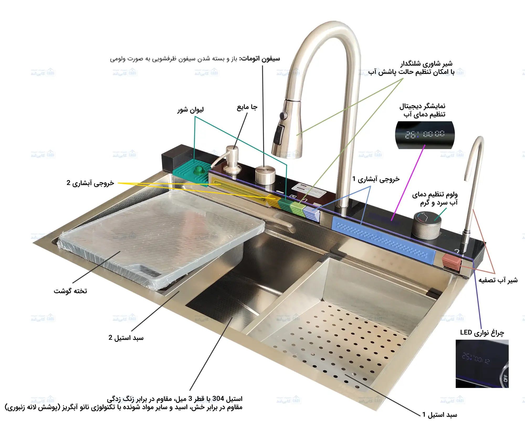 متعلقات سینک آبشاری: شیر آبشاری و شاوری، لیوان شور اتوماتیک، شیر آب تصفیه، جامایع روی سینک، 2 تا سبد استیل، تخته گوشت بامبو